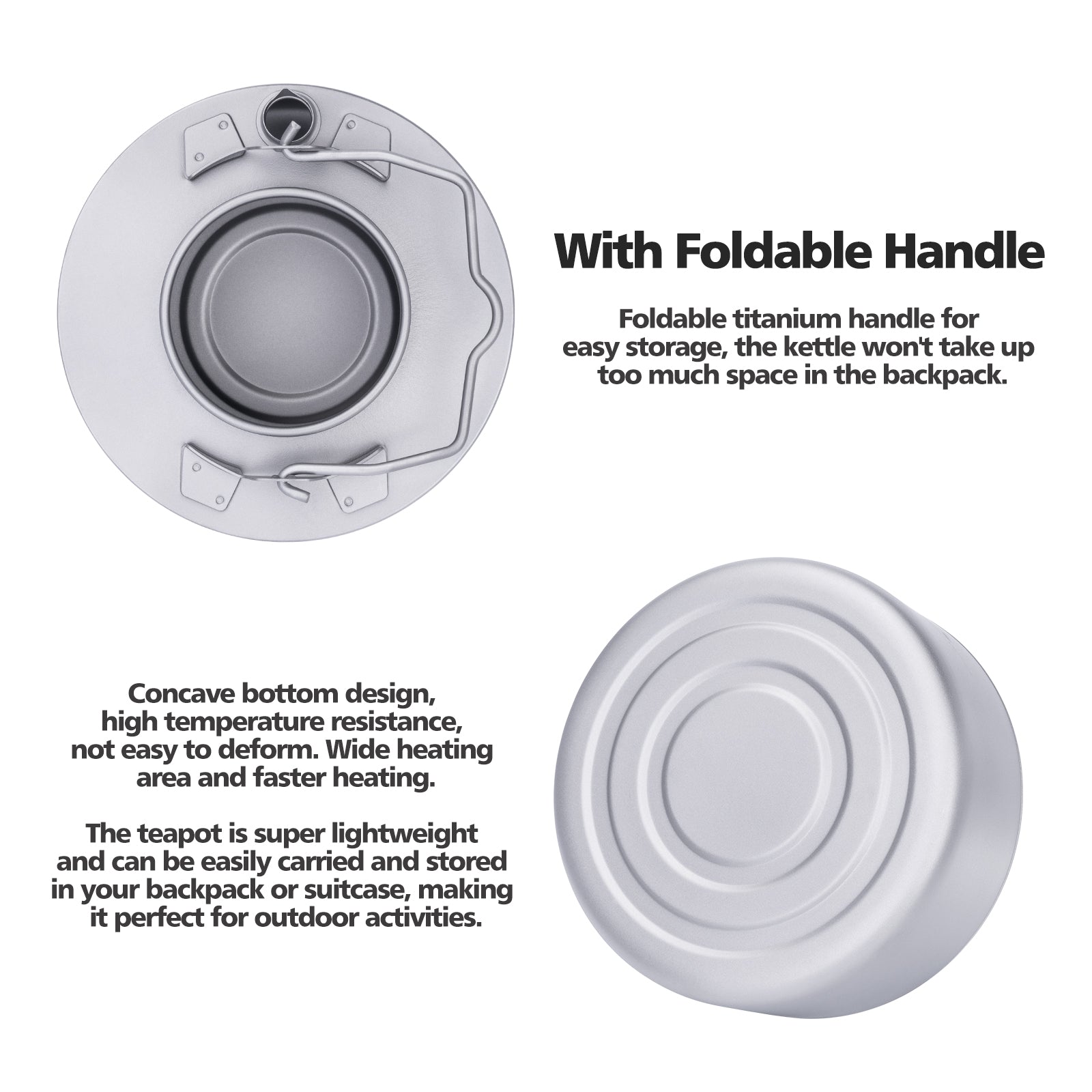6. With Foldable Handle: Foldable titanium handle for easy storage, the kettle won't take up too much space in the backpack. This teapot is ultralight and portable, it can fit well in your backpack or suitcase, it's easy to carry and store, very good for outdoor activities.
