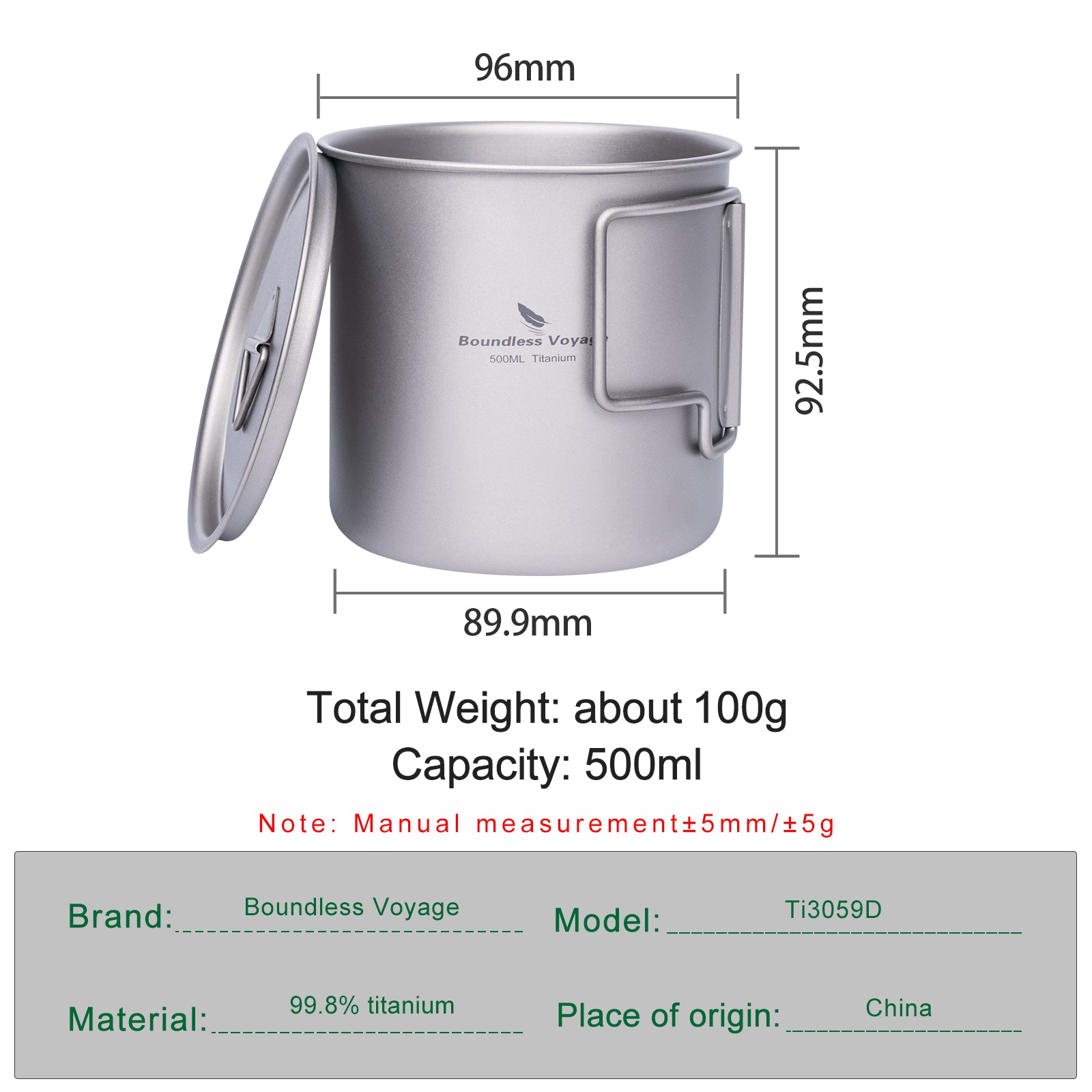 Boundless Voyage Camping Mug Titanium Cup 500ML Tea Coffee Cup Lightweight Outdoor Travel Portable Drinkware
