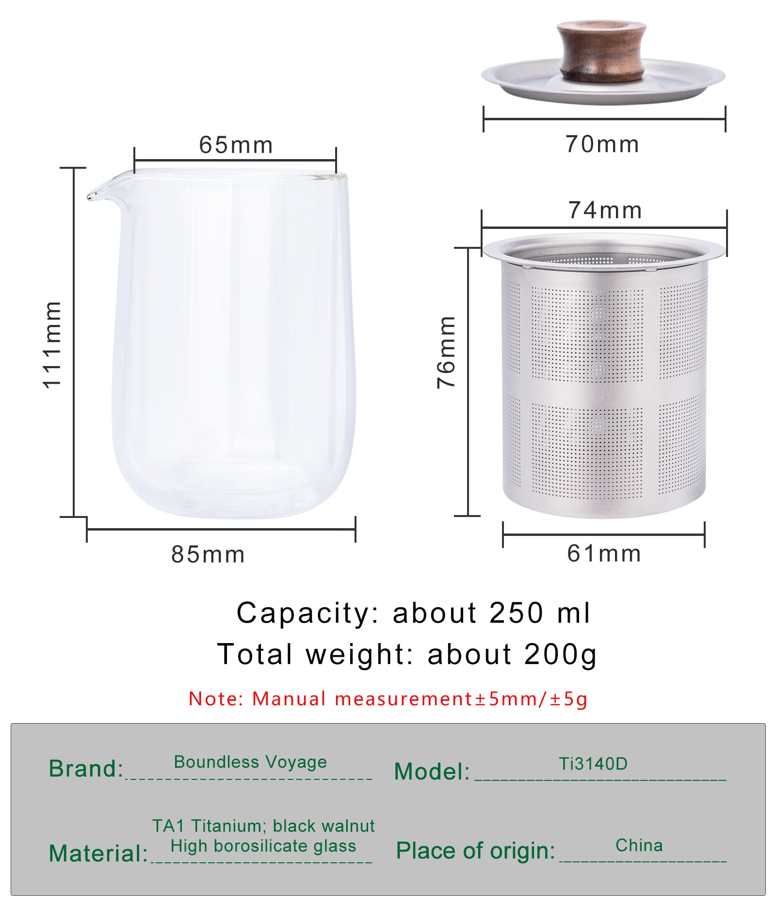 Material: TA1 Titanium; High borosilicate glass; black walnut