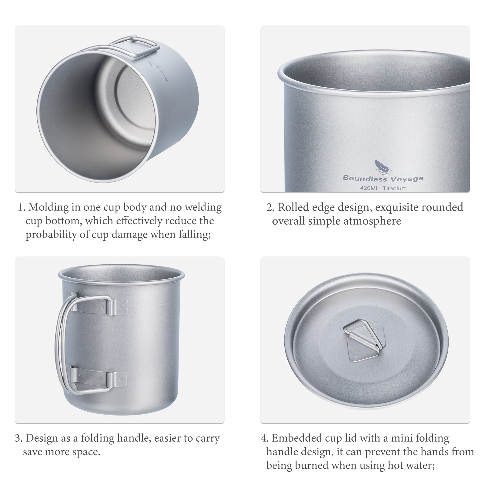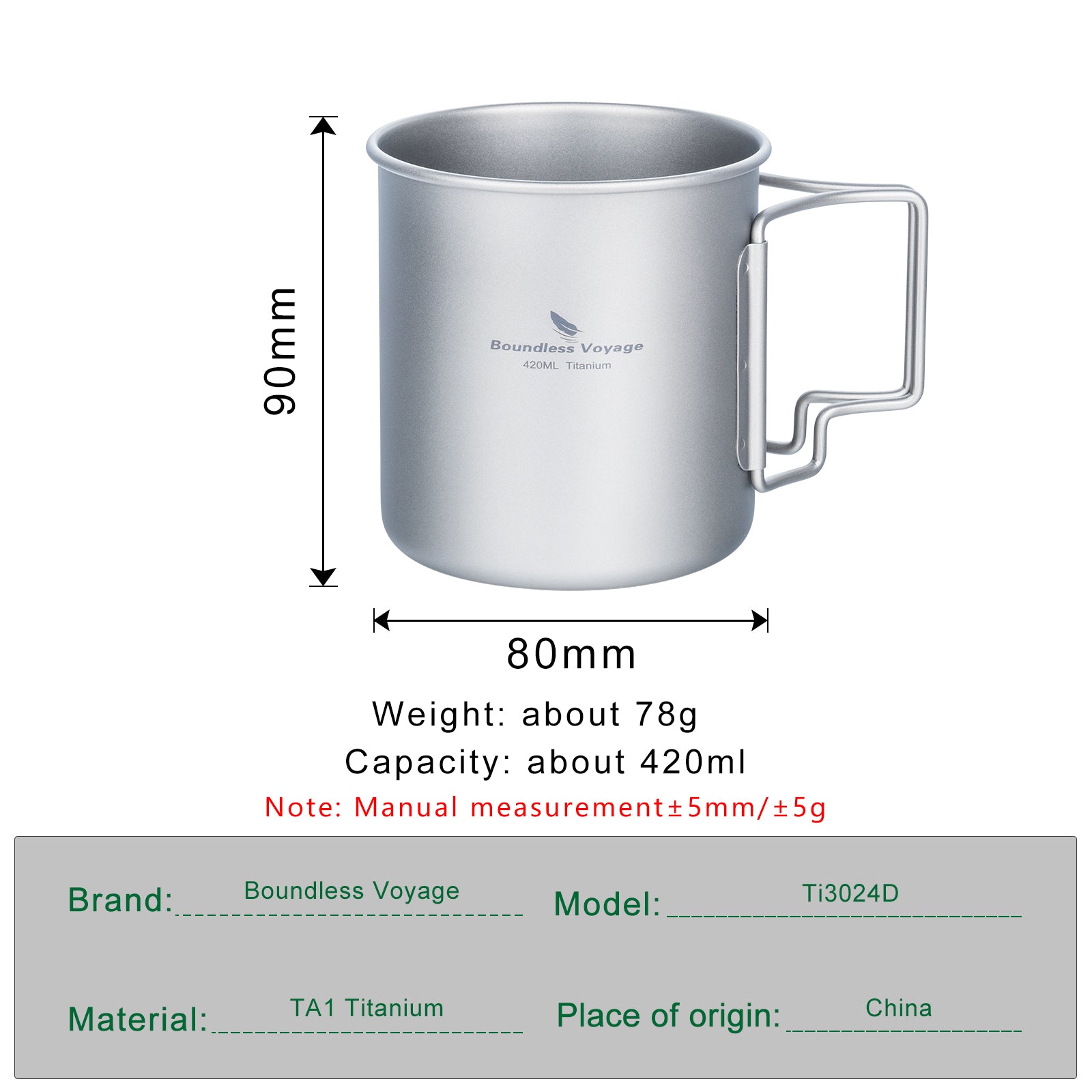 Boundless Voyage 420ml TA1 Titanium Camping Mug – Ultralight Foldable-Handle Cup for Water, Coffee & Tea Outdoors
