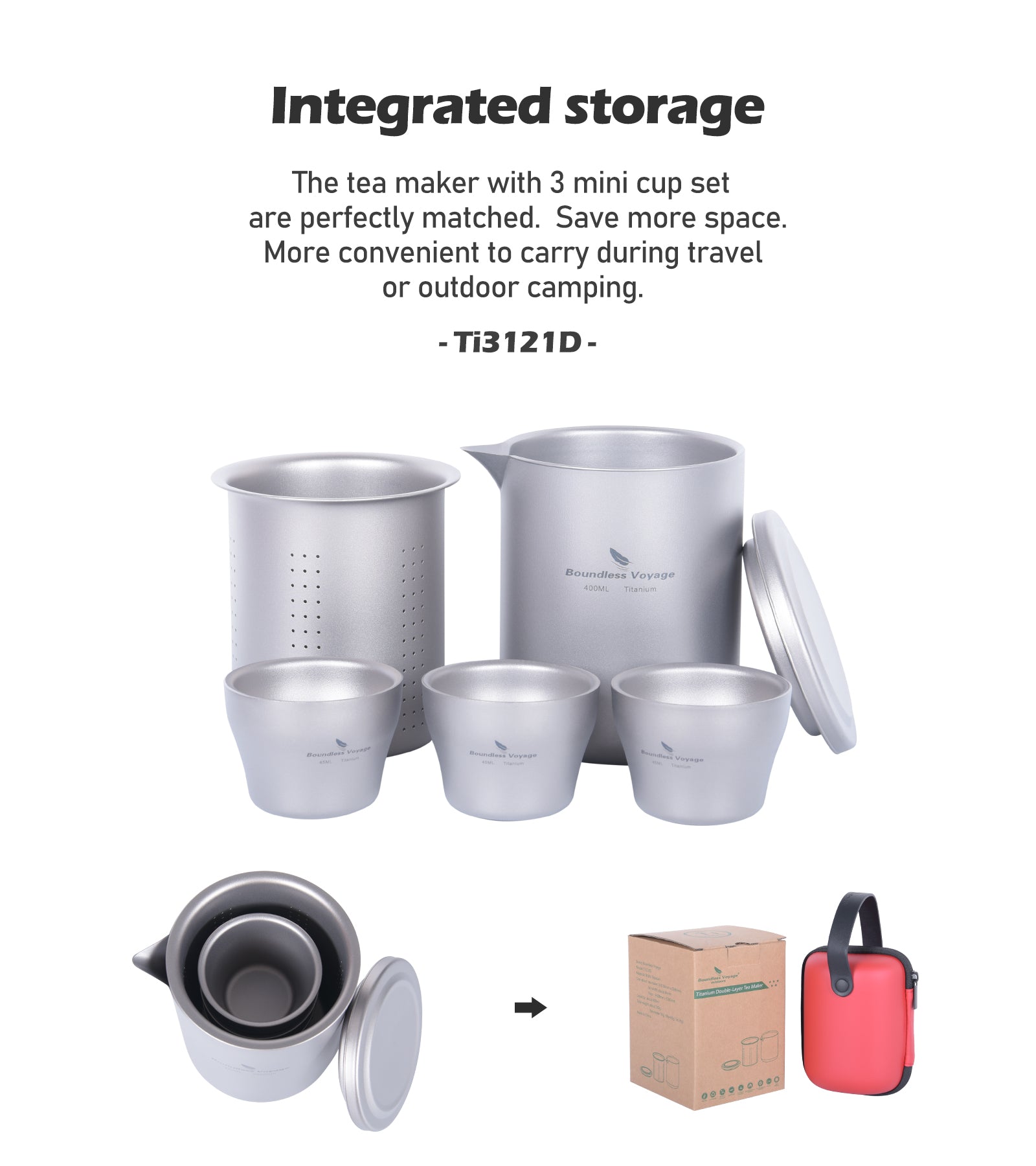 Seamless Nesting Design: The precision-engineered cups are designed to fit perfectly within or alongside the teapot, making it an ultra-compact system for travel and backpacking.