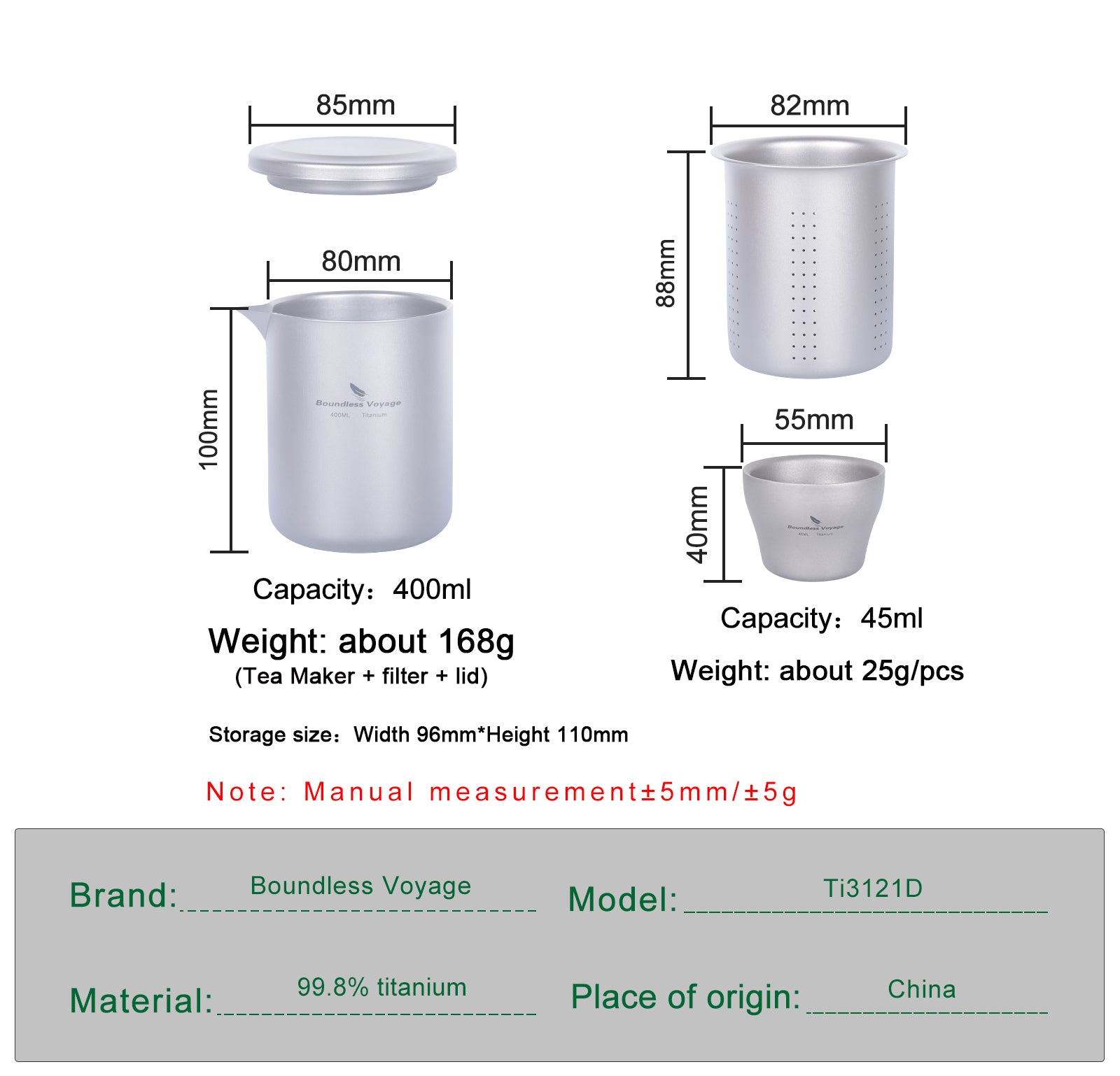Product Name: 400ML Titanium Double-Layer Tea Maker with 3PCS 45ml tea cup