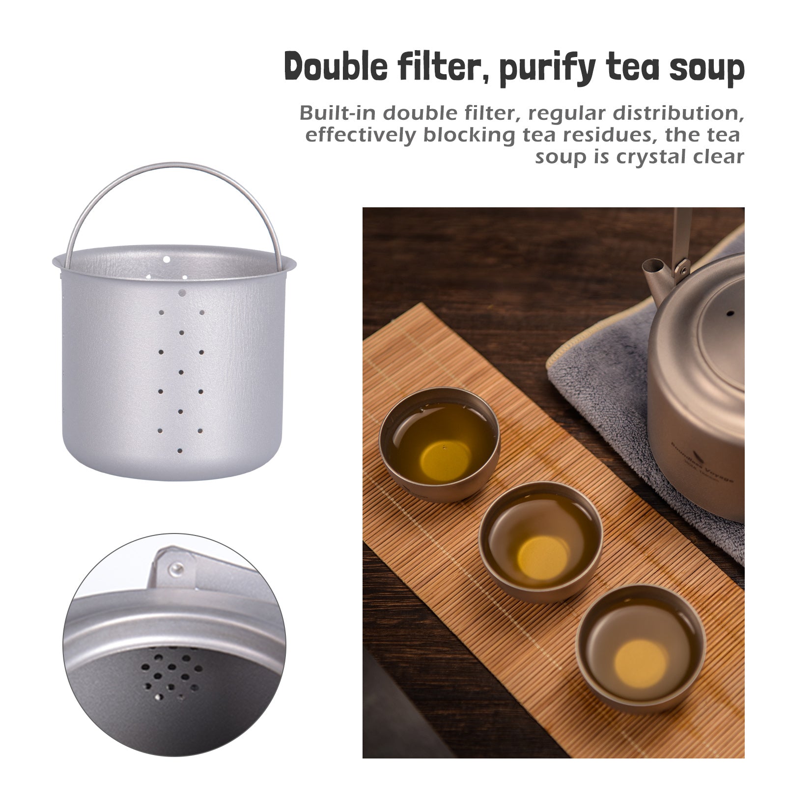 • Dual-Stage Filtration: Equipped with a removable pure titanium internal strainer and a secondary filter at the spout, ensuring a clear, debris-free pour for loose-leaf tea or coffee.