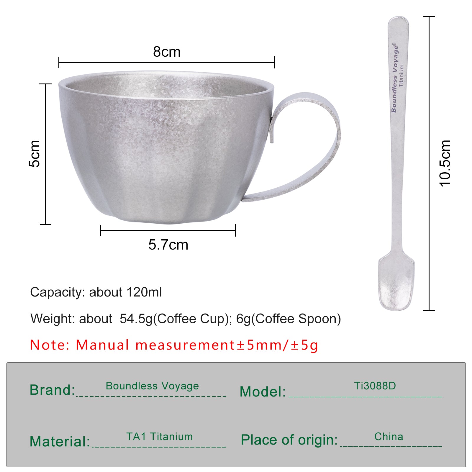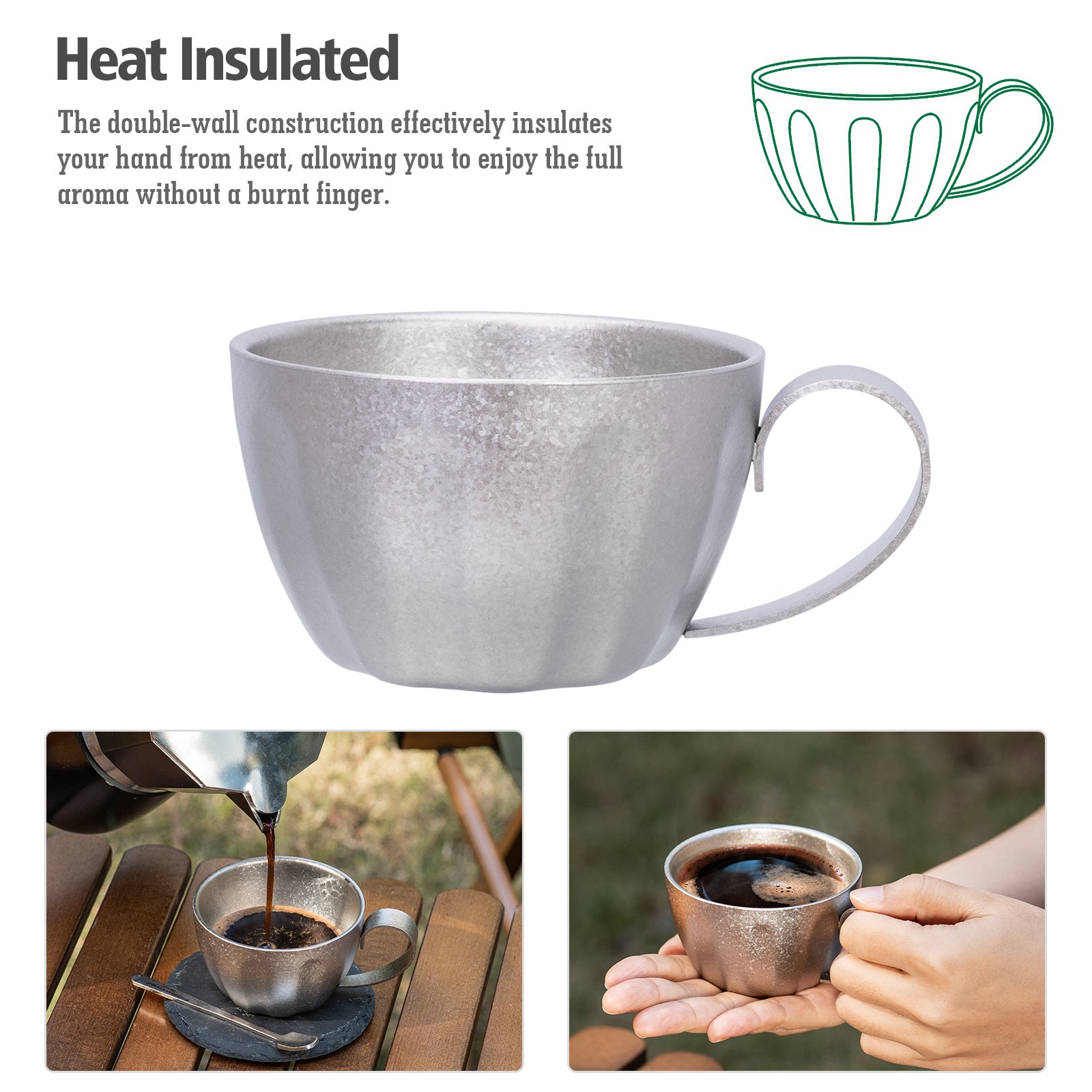 TA1 Titanium Construction — Lightweight, durable, rust-proof Double-Wall Insulation — Keeps espresso hot while preventing finger burns Fixed Handle Design — Stable, comfortable grip for daily use Includes Matching Titanium Coffee Spoon — Perfect portion and aesthetic match Pure Taste — No metal odor, preserves coffee aroma Compact & Portable — Ideal for home, office, or outdoor adventures Easy to Clean — Smooth surface, dishwasher safe Eco-Friendly & Non-Toxic — No coatings, safe for long-term use
