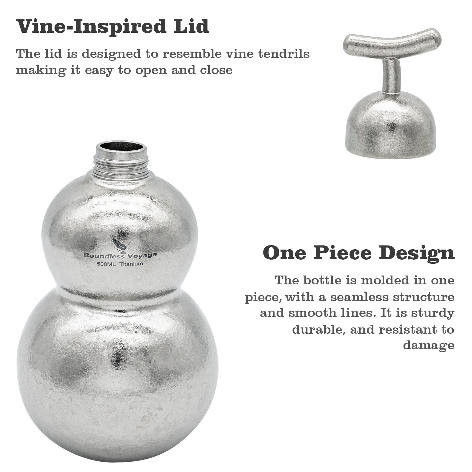 • Vine-Inspired Leakproof Lid: The artistic lid resembles natural vine tendrils for an easy-grip twist. Equipped with a food-grade silicone seal, it provides 100% leakproof security in your pack.