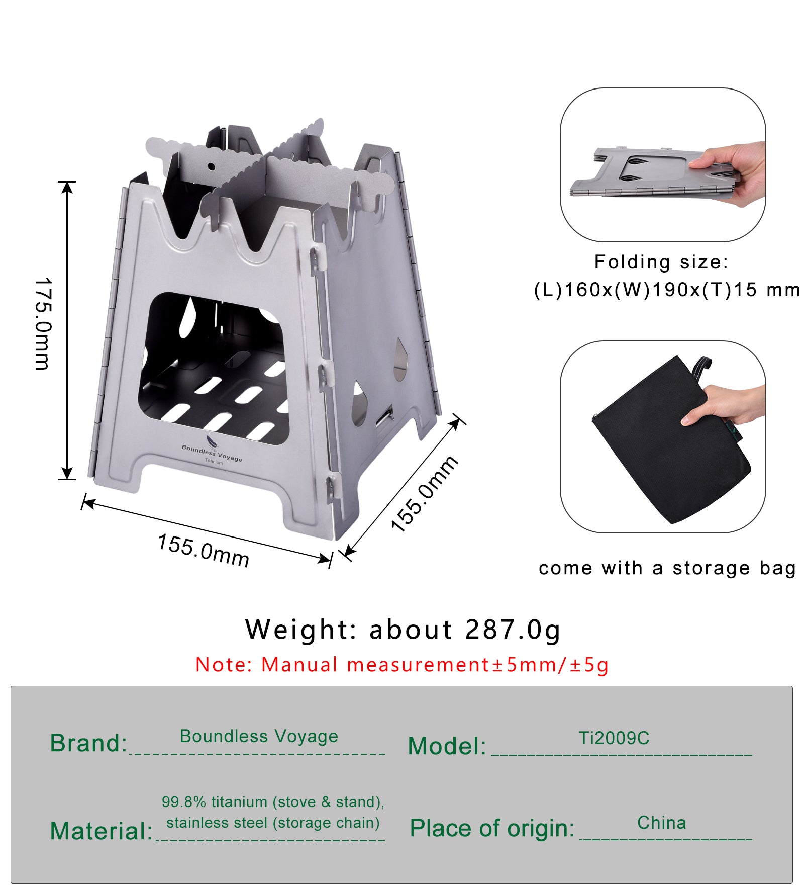 Material: 99.8% titanium (stove & stand), stainless steel (storage chain)