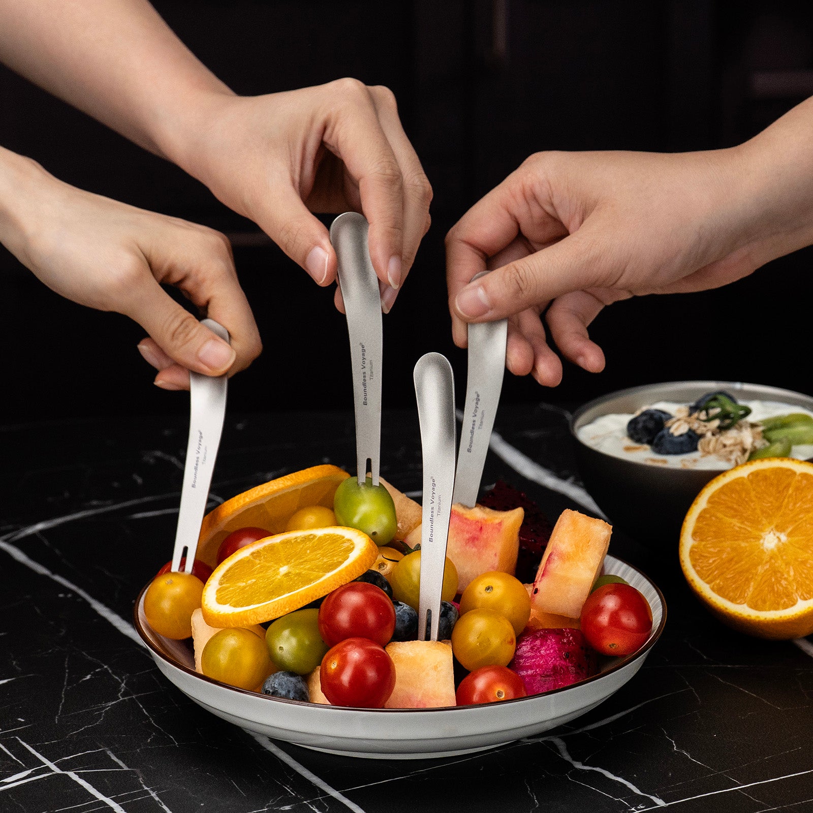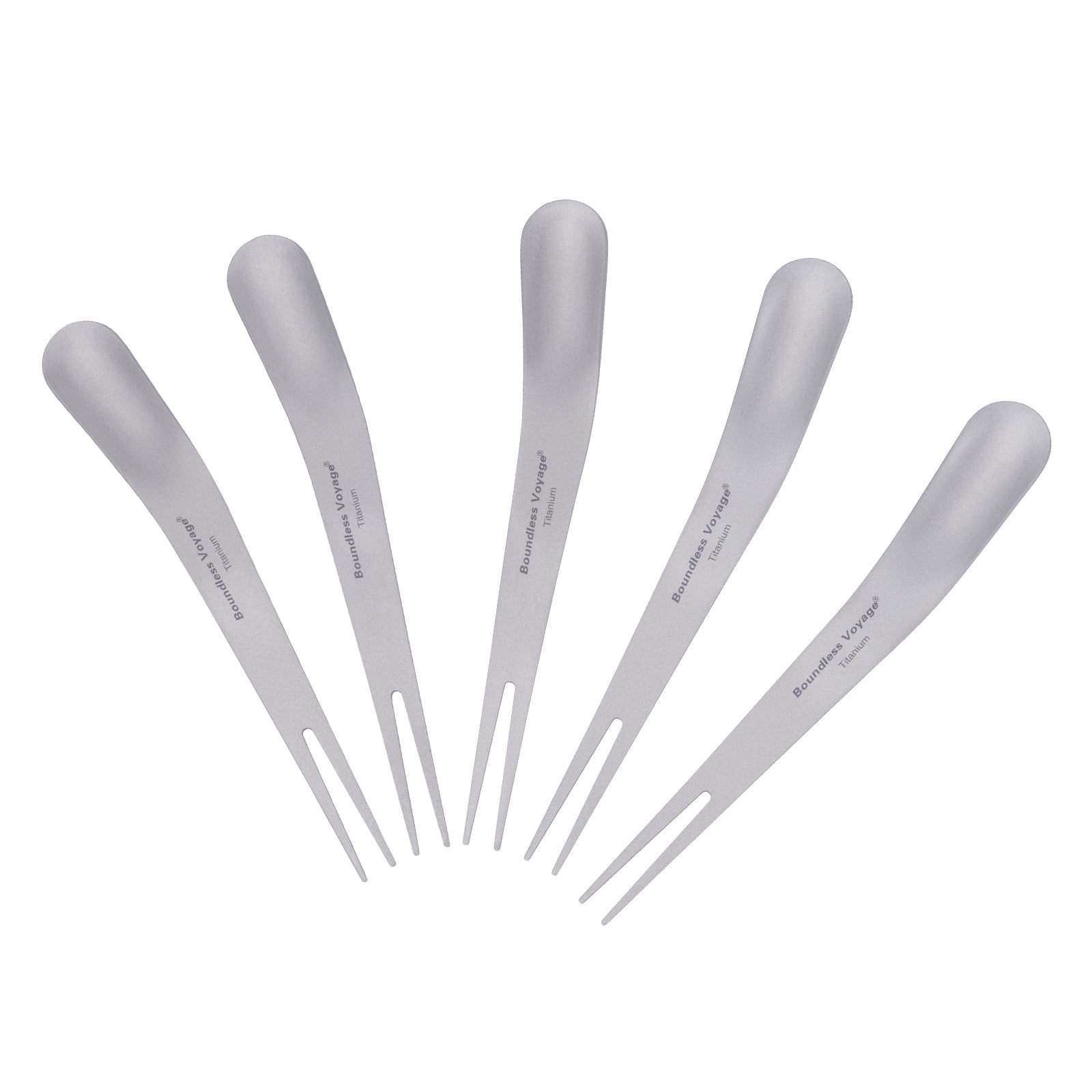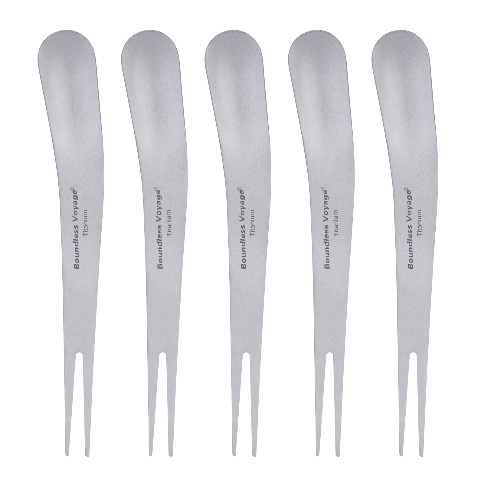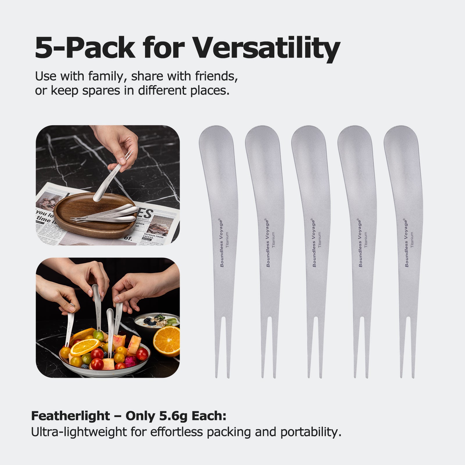 Boundless Voyage Titanium Dual-Use Fork & Spoon Set – 5pcs Ultralight Camping Cutlery with Drawstring Bag for Fruits, Coffee, Ice Cream & Travel