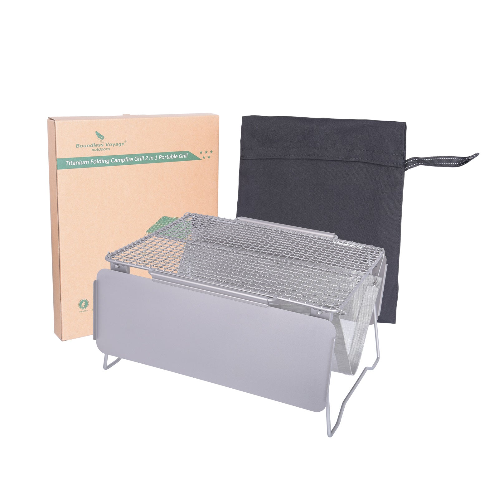 Boundless Voyage Titanium Folding Campfire Grill 2 in 1 Portable Grill Camping Table with Frying Plate & Folding Legs Outdoor Picnic Backpacking BBQ Charcoal Collapsible Grilled Net