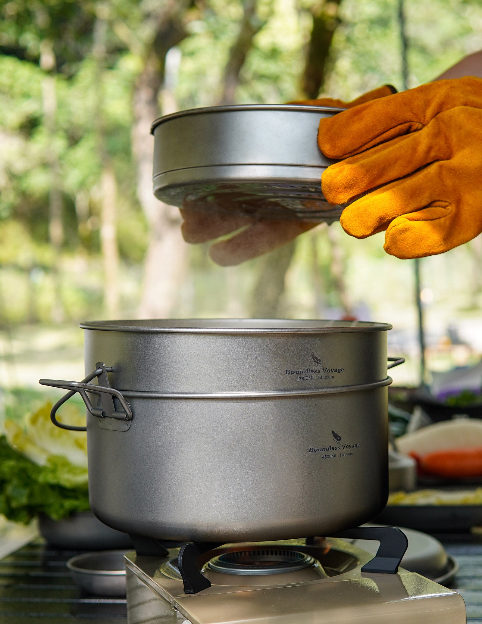 Cook healthy meals anywhere with the Boundless Voyage Titanium Steamer & Soup Pot Set, featuring 4.5L and 2L pots for versatile cooking. Made from ultralight, durable TA1 titanium, this set is perfect for camping, hiking, picnics, or travel, and even suitable for household kitchen use. The lightweight design with hanging handles makes it easy to carry and cook for 3–5 people on the go.