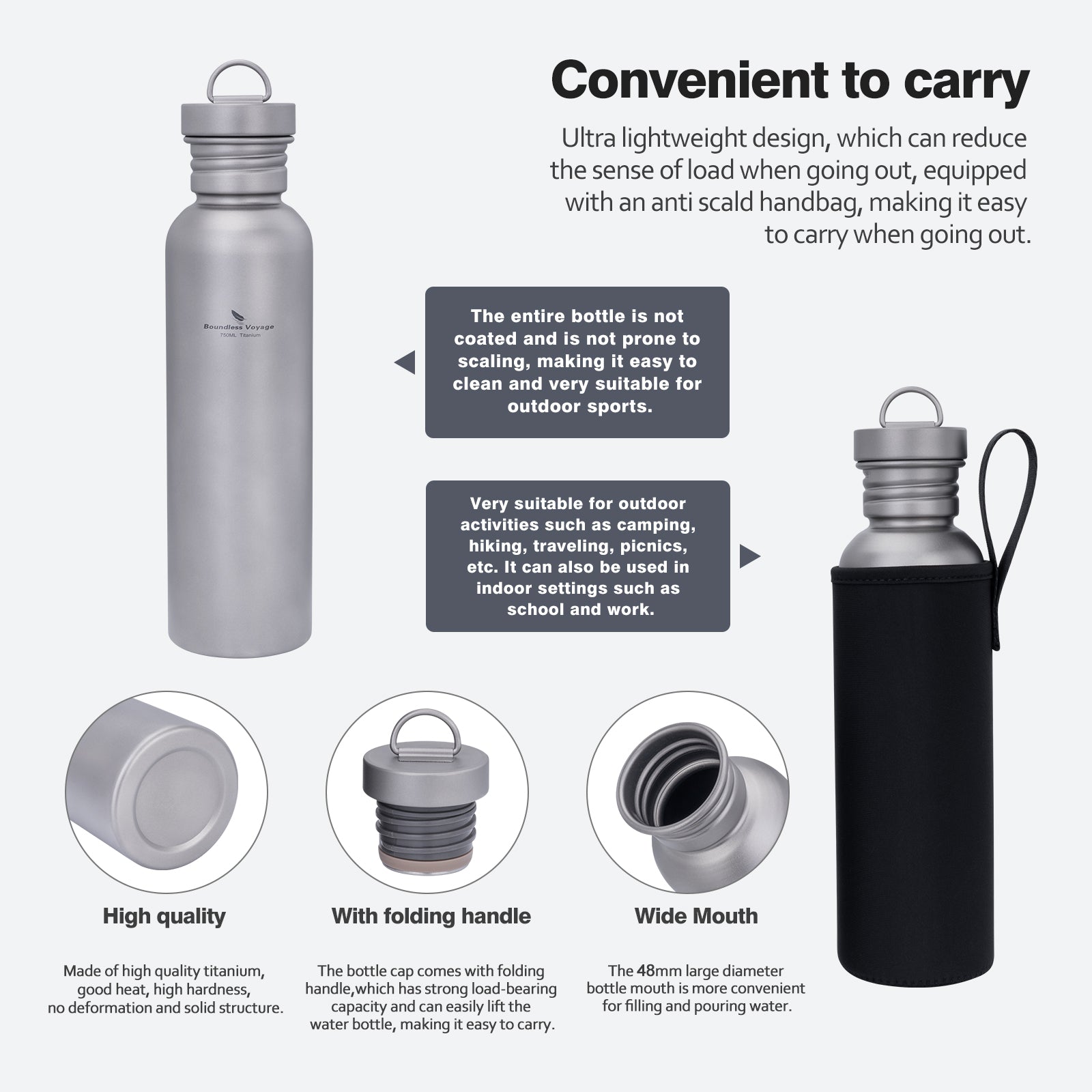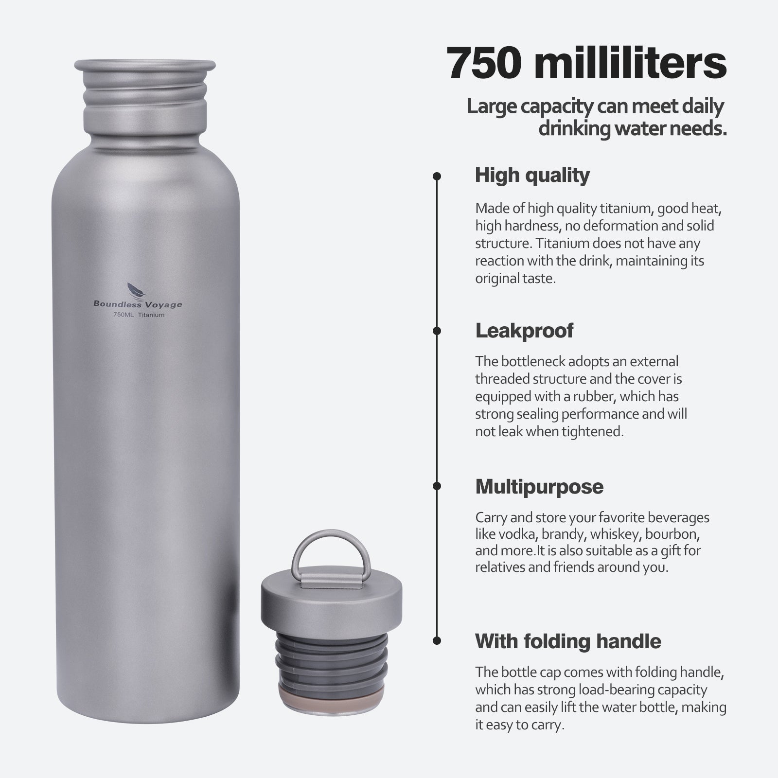 Boundless Voyage Titanium Water Bottle 750ml – Ultralight, Leak-Proof & Durable for Camping, Hiking & Everyday Use
